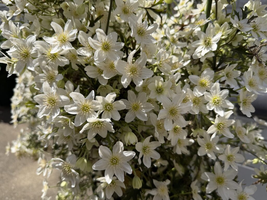 カートマニージョーはニュージーランド原産のフォエティダ系クレマチスで、日本では早春から春先にかけて開花する品種です。常緑性で冬も葉を落とさず、年間を通じてグリーンを楽しめる点が気に入っています。今年は3月下旬に最初の花が開き、その後暖かな日が続いたおかげで、ここ数日でいっきに満開まで進みました。